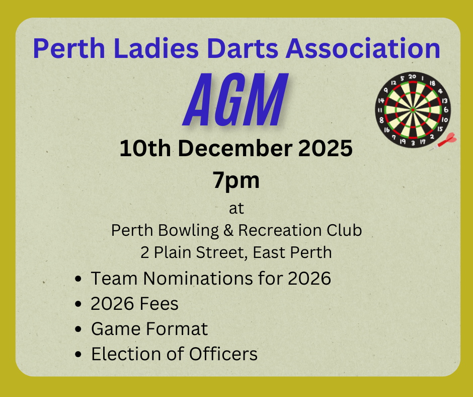 We aim to promote the game of darts for Ladies, Girls & Boys in the district of Perth Western Australia and we welcome new Members.