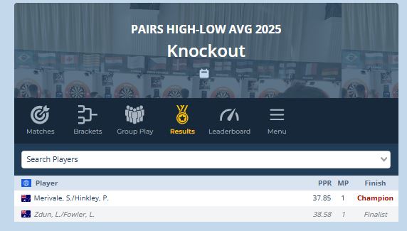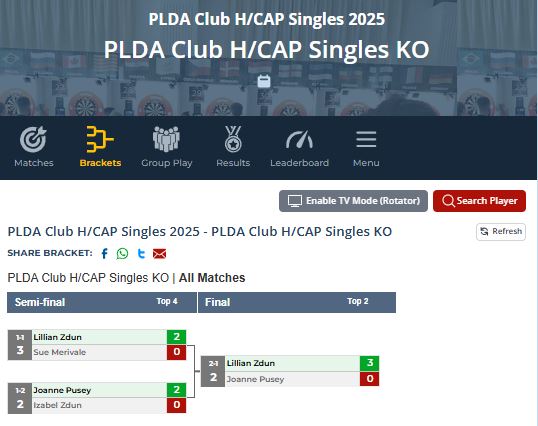 Congratulations to Sue Merivale on winning the event undefeated – well done! Well done also to all the competitors who threw some amazing darts.